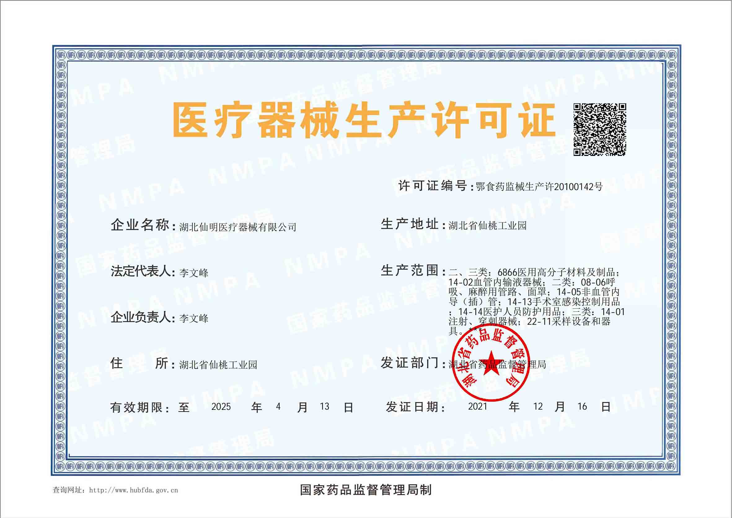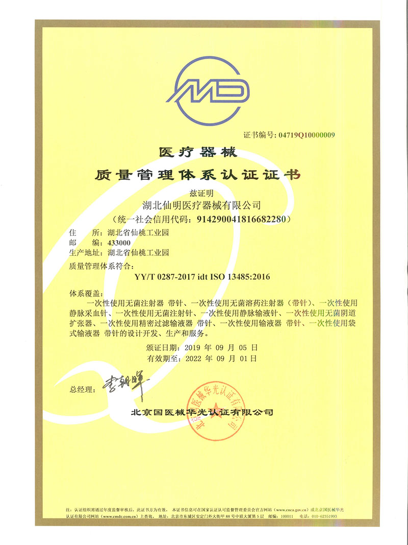 本公司已通過SO13485體系認證。近幾年獲得的各項榮譽有∶全國質量穩定合格產品、湖北省著名商標、湖北省守合同重信用企業,湖北省著名企業、湖北省最佳創新型民營企業、仙桃市知名商標等榮譽。